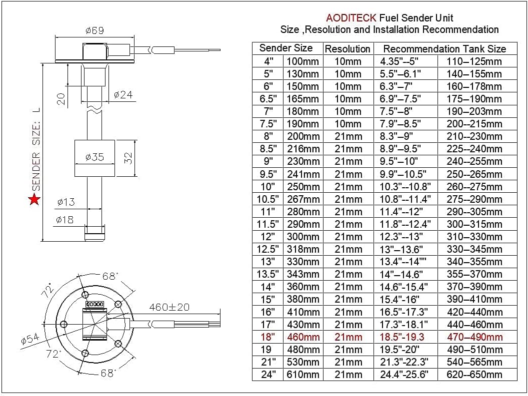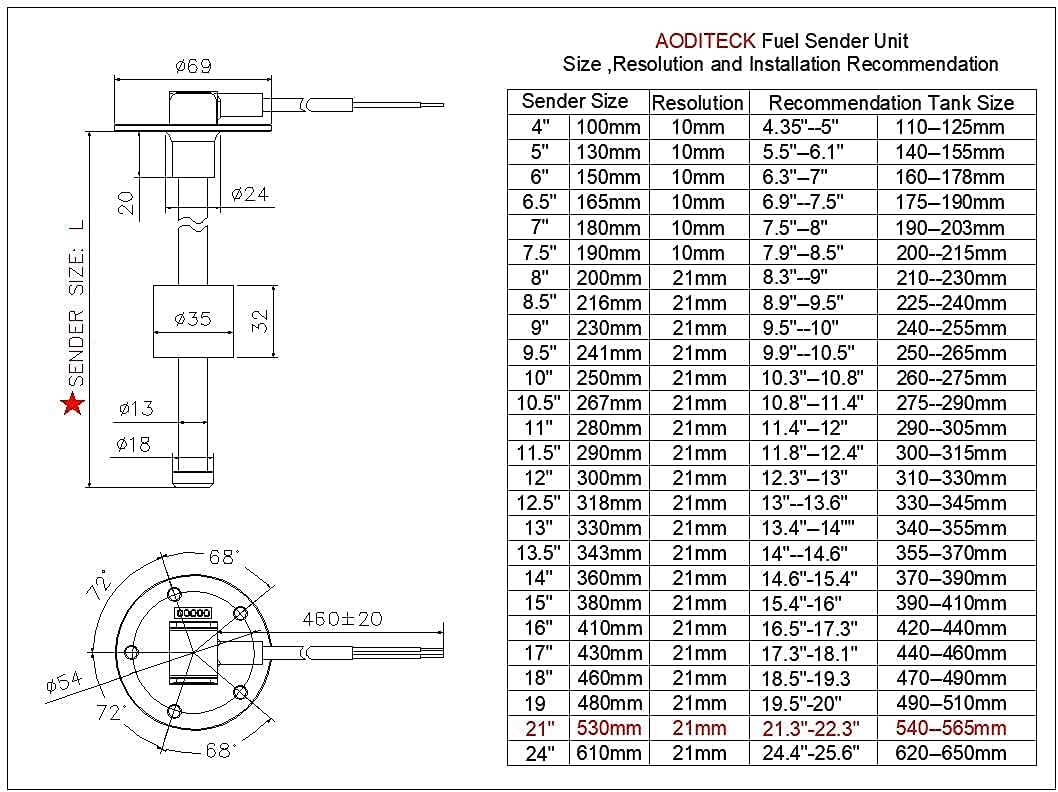 • [Note]: ① to allow the sender not hit the bottom of the tank, the length of sender should be 1" less than the depth of the tank if tank is plastic, and 0.5" less than the depth of the tank if tank is metal . ②The Diameter of Float is 1.38"(35mm). If You Have to Drill the hole, Diameter 1-1/2"(38mm) Hole Would be Perfect.③AODITECK Sender is with Non-Linear Output, It can only match with standard gauge with Non-Linear signal