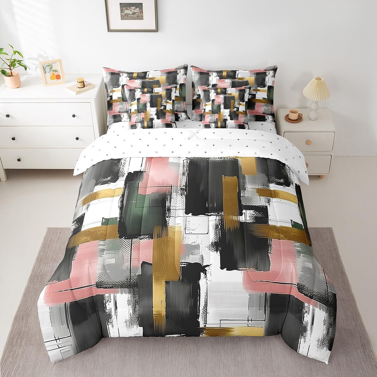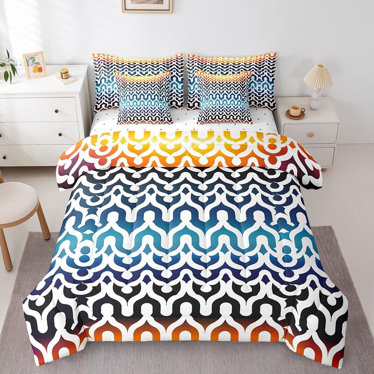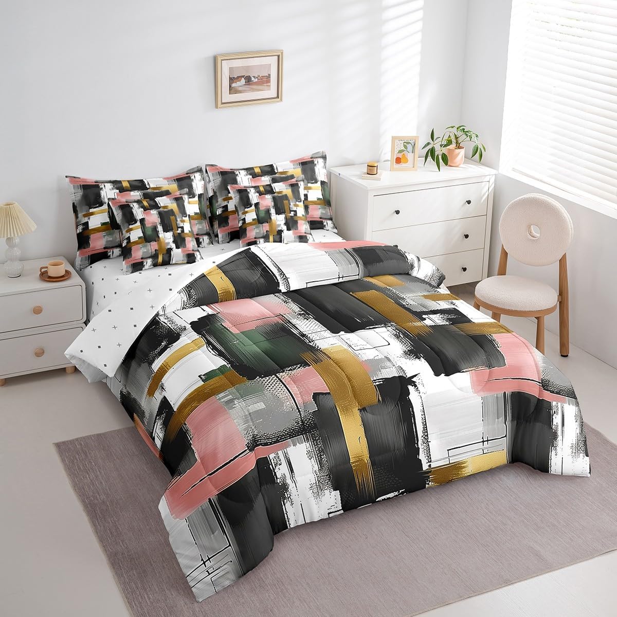 This unique modern 7 Pieces bedding set will enliven your room and bring freshness to it. Size Twin Size bed in a bag includes 1 Comforter 68"x90", 1 Flat Sheet 67"x96", 1 Fitted Sheet 39"x75"x16", 2 Pillowcases 20"x30" and 2 Throw Pillow Covers 18"x18". Full Size bed in a bag includes 1 Comforter 79"x90", 1 Flat Sheet 81"x96", 1 Fitted Sheet 54"x75"x16", 2 Pillowcases 20"x30" and 2 Throw Pillows Covers 18"x18". Queen Size bed in a bag includes 1 Comforter 90"x90", 1 Flat Sheet 102"x90", 1 Fitted Sheet 60"x80"x16", 2 Pillowcases 20"x30" and 2 Throw Pillows Covers 18"x18". King Size bed in a bag includes 1 Comforter 104"x90", 1 Flat Sheet 106"x90", 1 Fitted Sheet 78"x80"x16", 2 Pillowcases 20"x36" and 2 Throw Pillows Covers 18"x18". Material Polyester Great 7 Pieces Bedding for Room Decor Perfect choice for room decor such as bedroom, guest room, condo house, hotels, inn, spa, lounge, sauna, apartment building, and other spaces of home, dormitory, hotel, farmhouse and country house. Warm Reminder There is no difference in the product itself, but colors may appear slightly different to each user due to individual monitors. Please measure your bed properly and make sure you pick the right size. Attention to Detail for Your Satisfaction While we strive for perfection in showcasing our bedding sets, please note that actual colors may vary slightly due to individual monitor settings. Ensure to measure your bed accurately to choose the correct size for an impeccable fit and experience.