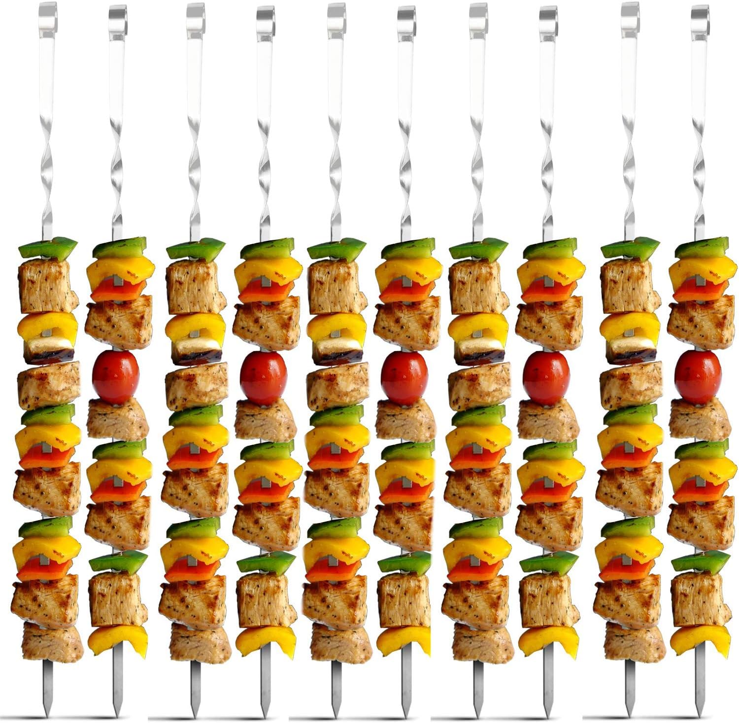 Expand the foods cooked on your barbecue or gas grill with stainless steel skewers perfect for making unforgettable shish kabobs! The professional metal BBQ skewers for American, Russian, Armenian, Middle Eastern, and even Asian food styles, they can be used with beef, fish, pork, carrots, onions, khabob, mushrooms and more. And because they feature a spiral end the food won’t slide off when you pick them up, making them per-fect for choosing healthier and more delicious meals. 12-Piece Skewer Set Best Food-Grade Safe Stainless Steel Brazilian, Persian, Armenian and Turkish wide long grill skewers Ring-Tip, Non-Slip Handle Reusable and Eco-friendly Rust Resistant Dishwasher Safe Weight: 2.1 lb. Length:22in Width:0.4in Thickness:0.08in Notice 1.The length 22 inch is the whole product length,details:The handle portion is about 3 inch, the twist portion is about 3 inch,the food placing portion is about 16 inch. 2.Don't touch the heating areas,wearing heat resistant gloves is better. 3.If you are not satisfied,please let us know,don't complain to Amazon directly,we will handle it smoothly,tell you the right way,make refunds or resending you a new set.