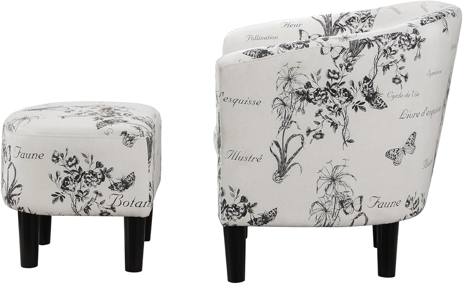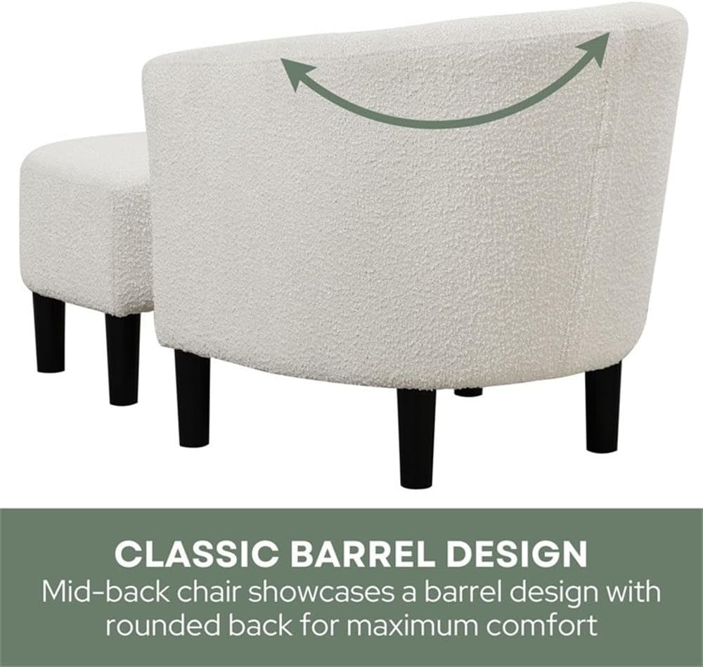 Snuggle up in the Take a Seat Churchill Accent Chair with Ottoman by Convenience Concepts. This comfy contemporary duo gives you the perfect spot to kick up your feet and relax after a hard day of work. Design options are endless and adding a pop of color to any room is easy thanks to the multiple different fabrics available to choose from. This mid-back chair showcases a classic barrel design with a rounded back; curved armrests; and black clean-lined legs. A matching half-oval ottoman with a clean rounded frame perfectly coordinates with the U-shaped chair and gives lavish comfort to your feet and legs. The wooden frame of this sturdy chair and ottoman set is supported by solid rubberwood legs for long-lasting usage. The thick upholstered cushion contains high-density foam; and the soft polyester printed fabric lining of the chair includes fine sewing details for a neat and firm finish. This duo; perfect for small spaces; arrives almost fully assembled with only the legs needing to be attached. Cozy up next to the fireplace in the chic Take a Seat Churchill Accent Chair with Ottoman by Convenience Concepts today!