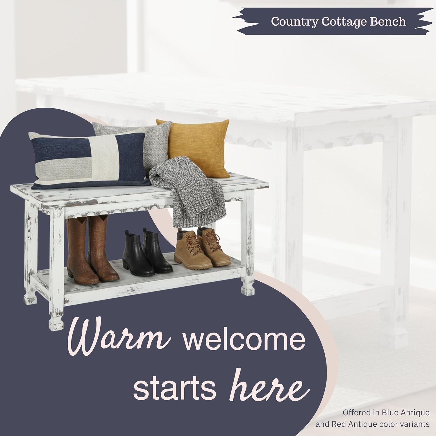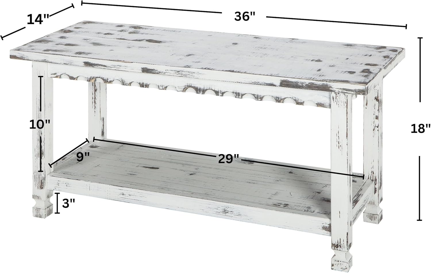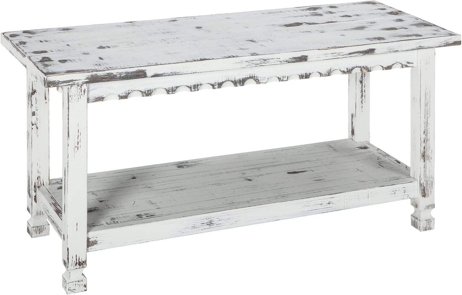 Add rustic charm and practical storage to your home with the Alaterre Country Cottage 36-Inch Farmhouse Bench with Storage Shelf. Crafted from durable pine and acacia wood with a distressed white antique finish, this bench features classic carved edge design and square turned legs for authentic cottage style. The lower shelf provides convenient space for shoes, baskets, or décor, helping you keep entryways, hallways, bedrooms, or mudrooms organized and tidy. Measuring 36" W x 12" D x 18" H, this compact bench fits perfectly in small spaces while offering sturdy seating and functional storage. Its solid hardwood and composite wood construction ensure lasting durability, while easy assembly and simple maintenance make it a hassle-free addition to any room. Wipe clean with a dry cloth to keep it looking fresh and inviting. Whether you're adding a cozy spot to put on shoes or a decorative accent that enhances your farmhouse, shabby chic, or cottagecore décor, this bench delivers both style and function in one timeless piece. IMPORTANT: Alaterre Furniture is committed to providing the consumer with the absolute best price and value on all of our products. NOTE: This is an exclusive product of Alaterre Furniture and ONLY Benches by Alaterre Furniture are GUARANTEED to be genuine. Avoid buying counterfeit products and transacting with unauthorized sellers.