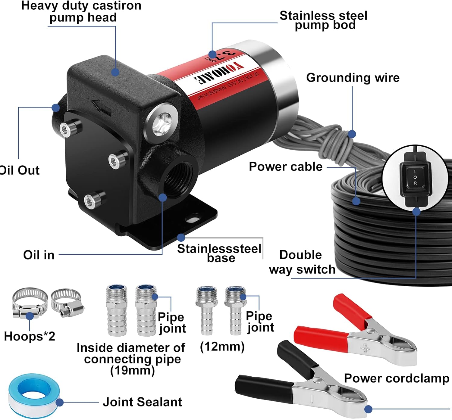 Equipment Parameter Voltage: DC 12V Power: 1/10HP Working Amps: 6.2A Max. Amps: 8A Flow Range: 2.3/3.7G.P.M Max. Head.: 19 ft./5.8m Max. Suction: 4.9 ft./1.5m Inlet/outlet Port: NPT1/2" Running mode: Forward/Reverse Run Compatible Fluids: Gasoline/Diesel/Light oil Duty cycle: 30mins