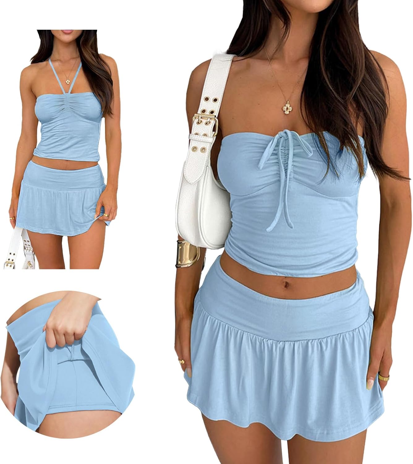 Meet you going out for a playful and flirty look! 2024 New Two Piece Set features a trendy strapless top with a drawstring tie ruched front detail and a cropped length, paired with a pleated skort (skirt and shorts underneath) for a fun and versatile style. Made with a soft and stretchy, double layered fabric, this set is both comfortable and chic. Get ready to turn heads and make a statement in this must-have set.c Size Chart XS Bust: 25.9-32.2"; Top Waist: 23.6-28.3"; Hips: 29.9-36.2"; Skirt Length: 11.4"; S Bust: 27.5-33.8"; Top Waist: 25.1-29.9"; Hips:31.4-37.7"; Skirt Length: 11.8"; M Bust: 29.1-35.4"; Top Waist: 26.7-31.4"; Hips:33-39.3"; Skirt Length: 12.2"; L Bust: 31.4-37.7"; Top Waist: 29.1-33.8"; Hips:35.4-14.7"; Skirt Length: 12.6";