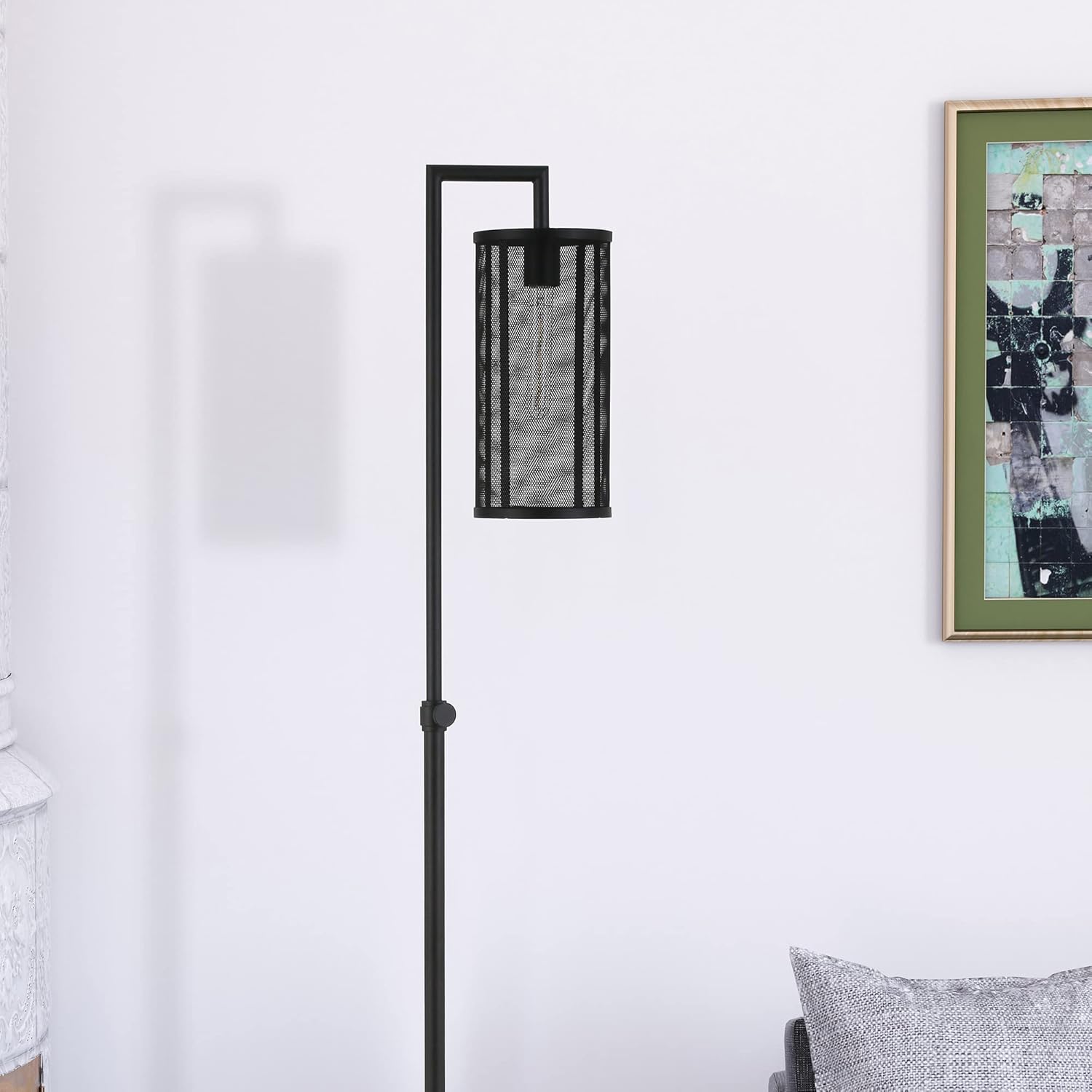 This industrial floor lamp takes notes from factory lighting. It creates a moody ambiance with the perforated metal shade, enhancing the textures in both the lamp and the room around it.