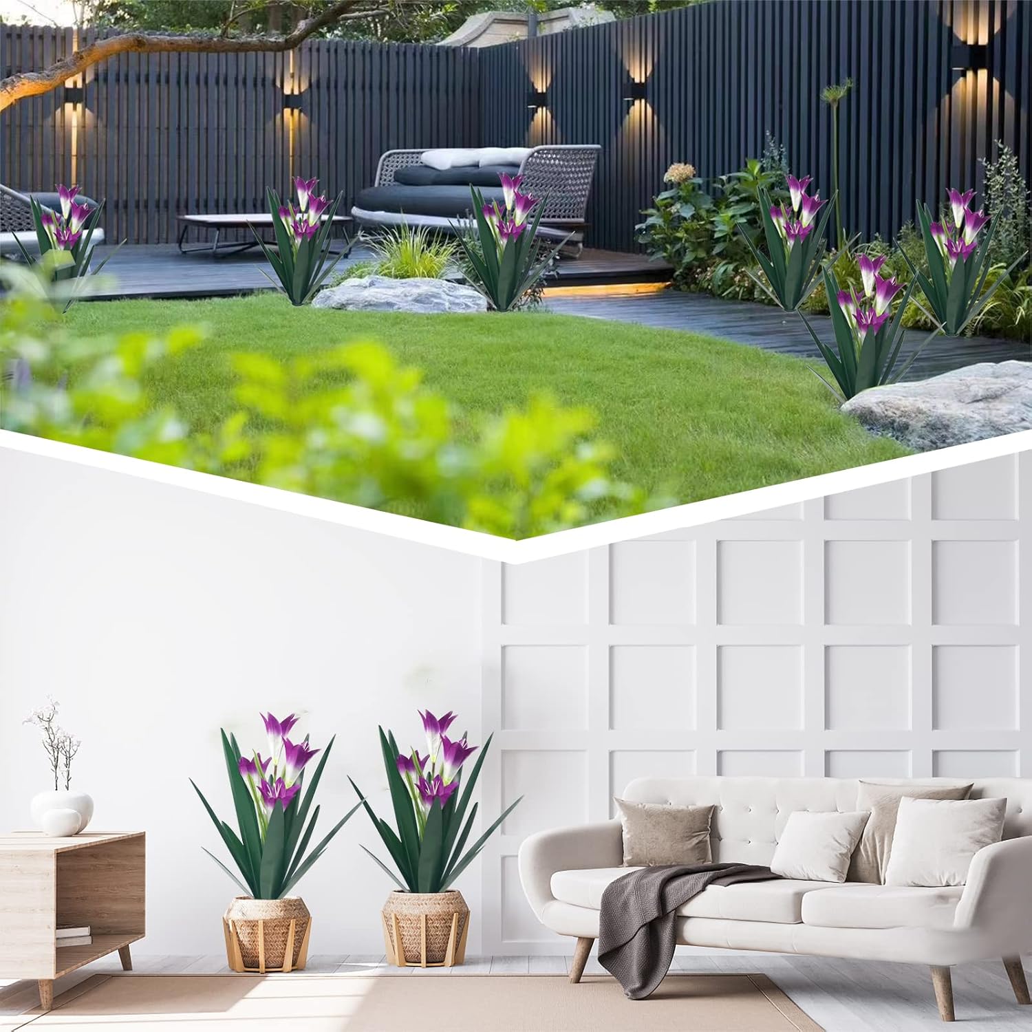 The metal agave is 16 inches tall, with nice lily flowers in the middle, and comes with a ground insert for more firm resting on the ground. Just place it anywhere you want, garden, yard, patio. It can be placed on the ground, on the patio, and used as a planter -- outdoors or indoors, it will brighten up any space you place. This particular agave plant looks like it grows out of the ground.