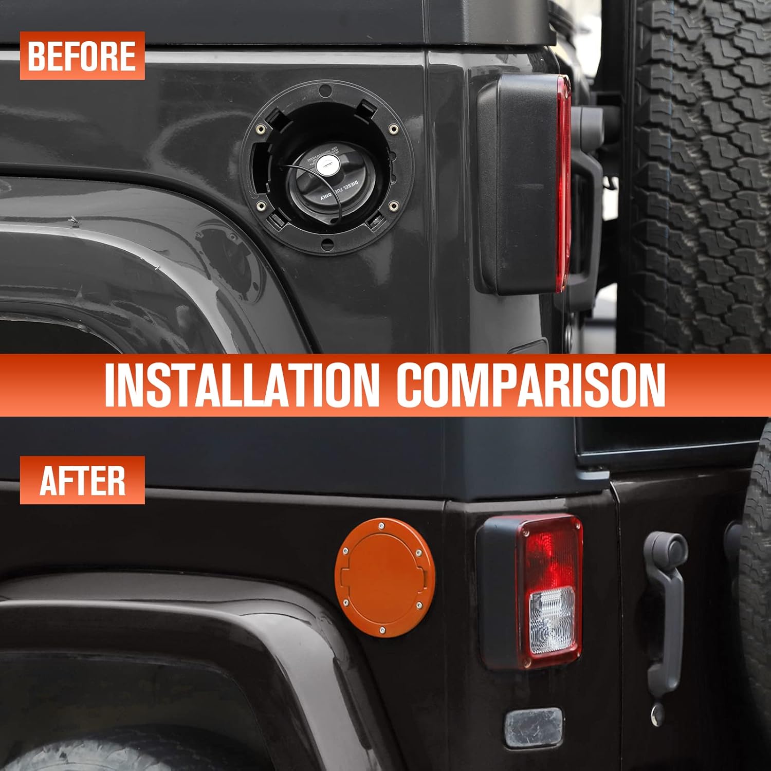 Features: - Textured Black Powder-Coat Finish - Rugged Off Road Styling - Bolt-On Installation - Fit for 2007-2018 Jeep Wrangler JK & Unlimited Rugged Styling. JeCar Gas Cover adds an extra level of customization for an aggressive appearance. Not only will this textured black fuel door look great, but it also adds superior protection to your JK. Durable Construction. The JeCar Gas Tank Cover is made of aluminum and crafted with the highest standard ABS plastic, which makes it fully proof against rust. It's also very resistant to corrosion from gasoline and other harsh car-related chemicals, so it can stand up ruggedly to its intended use. Easy to Install. This non-locking fuel door is finger notch opening. Installation does not require any drilling, just easy bolt-on installation using the supplied hardware. Note: The pinhole position of 2-door JK and 4-door JK is different. The pin guide of our gas cap cover matches 4-door. You may need to knock the pin guide off to install it on a 2-door if you don't wanna drill a new pinhole. Package Included: 1 x JeCar gas tank cover 1 x Gasket 1 x Allen wrench