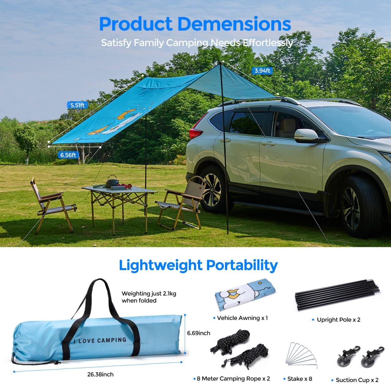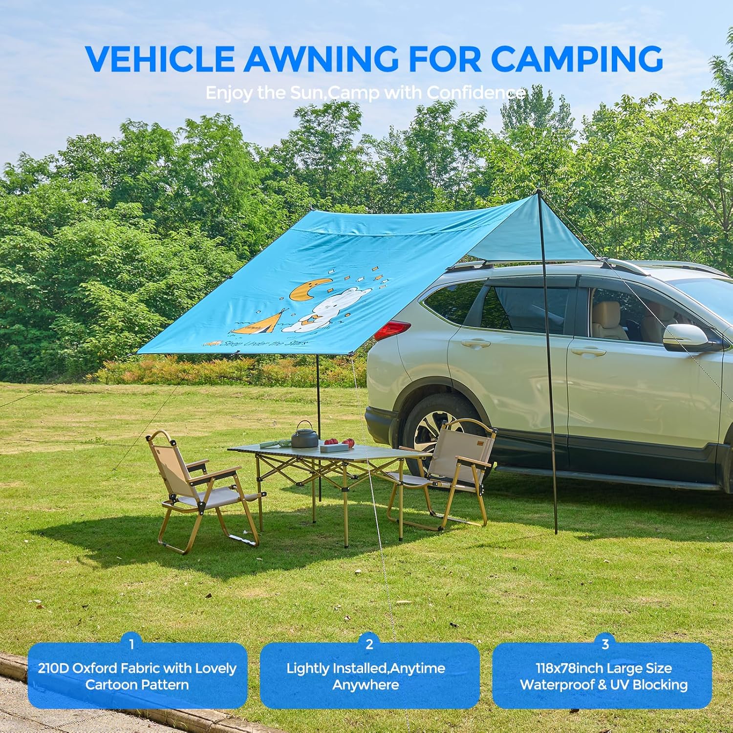 [118 SqFt Large Shade - Family Outdoor Shelter] 118"x78" large size can cover 8-10 people, easily accommodating picnic tables and chairs + barbecue grill + pet area! Double-layer wind-resistant structure ensures safety on rainy days, allowing children and furry friends to run freely on the beach/campsite. [5-minute quick installation - no professional tools required] 6 reinforced holes + 2 universal adjustment buckles, suitable for all SUV/MPV/pickup trucks. No roof rack? The guide rails along the top of the window can also be firmly installed! Female users can also complete the construction independently. [Rainstorm-level waterproof + 50+ UPF sunscreen] 210D silver-coated Oxford cloth passed the 2000mm water pressure test (industry average 1500mm), UPF50+ blocks 99% of ultraviolet rays. The sky blue curtain design with cartoon white bear pattern is deeply loved by children. 【Lightweight design - easy to store even in Jeep】 After folding, it is only 26.9"x8.2" (the average of peers is 35"), and weighs only 4 pounds! Free military-grade storage bag, which can be attached to the rear of the car/stuck into the door panel, saving 60% space compared to traditional awnings. 【Multi-scene coverage - buy 1 and get 3 uses】 Camping mode/beach pavilion/backyard party canopy with multiple uses! Free 8 windproof ground nails + two body suction cups, two 8-meter extra-long windproof ropes + 1-year warranty, direct replacement for sunburn/leakage.