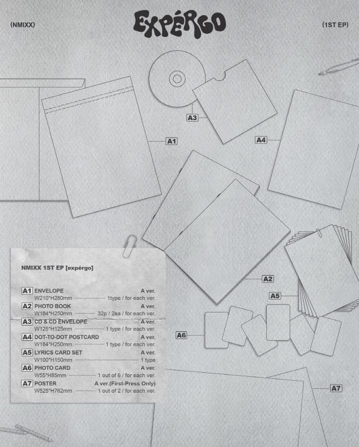 NMIXX EXPERGO 1st Mini Album Standard Version package includesCD+32p Photo Book+1p Dot-To-Dot Post Card+Lyrics Card SET +1p Photo Card+Free Tracking Number.Depending on versions , contents inside the album may differ.Folded Poster may NOT be included.Track ListDisk(CD) 1. We will be updated soon...✔Officially distributed Brand New & Original item from Manufacturer. ✔All items from original manufacturers are delivered in original sealed package condition. ✔Your purchase quantity will be count on Korea HANTEO & GAON Chart! ✔All ordered item will be shipped with a tracking number. ✔All products are packed and shipped in box.