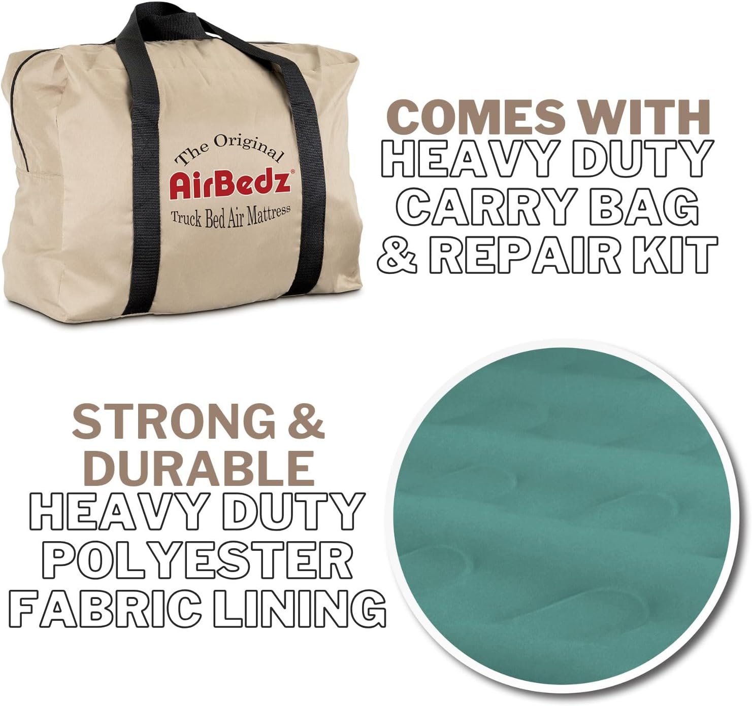 AirBedz Pro3 Mattresses are designed to fit around and over the wheel wells of your pick-up creating a sleep area that utilizes the entire truck bed, providing more room and comfort for outdoor enthusiasts. Heavy-duty cloth construction ensures a more puncture resistant mattress meeting the extreme outdoorsmen's needs.where playing hard and sleeping well are all that matter. Optional inflatable Wheel Well Inserts transform AirBedz into a standard air mattress great for both home and tent use.