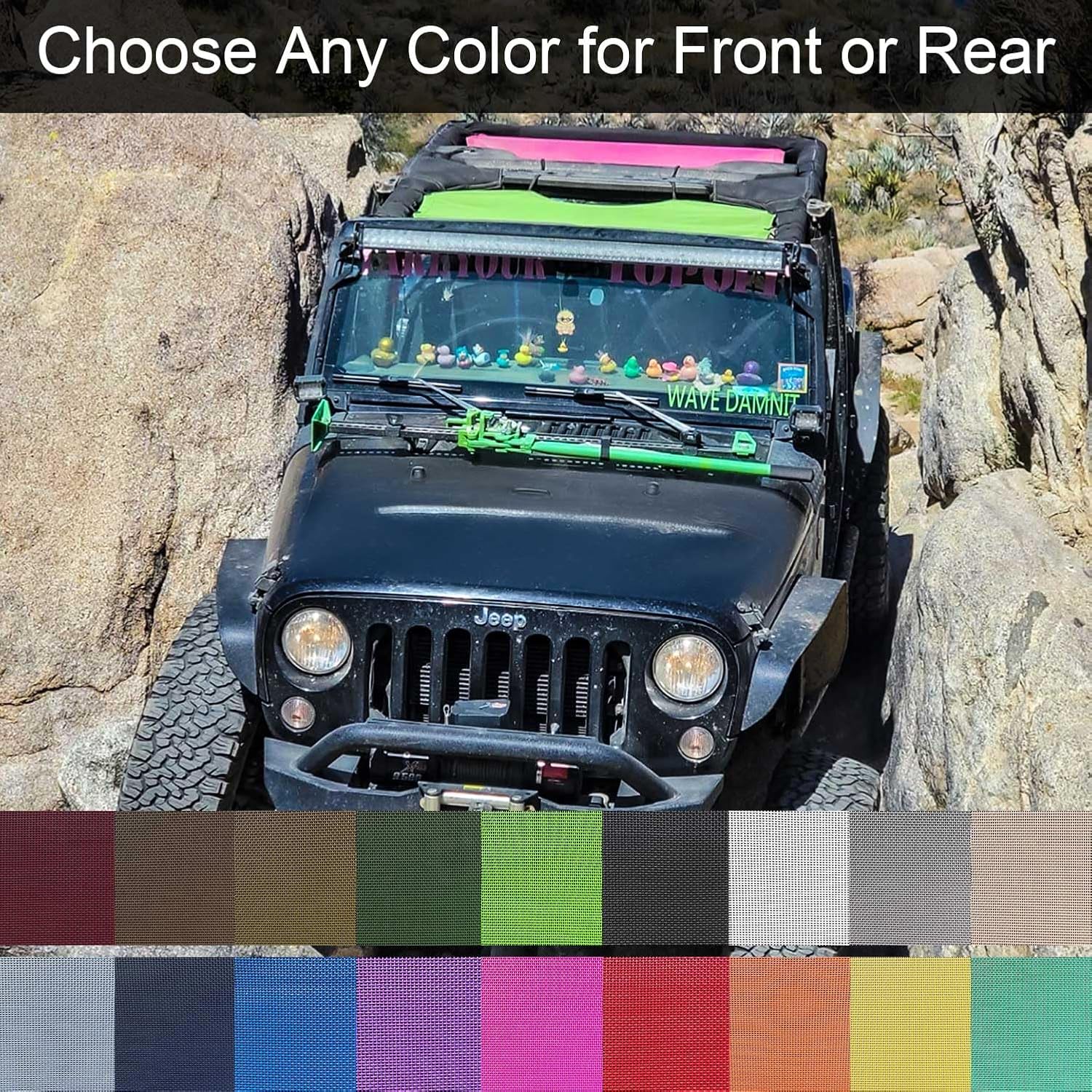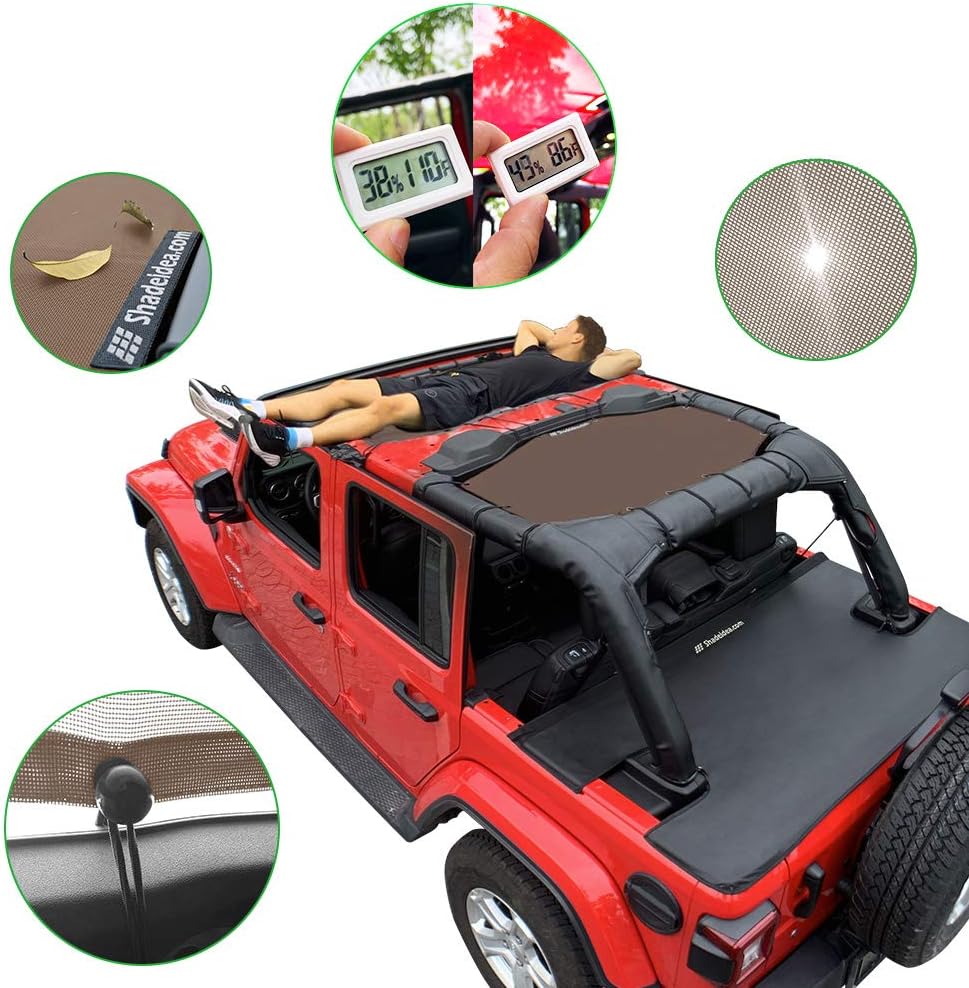 Shadeidea Jeep Wrangler JL 4 Door 2018-2023 Top Sun Shade Screen is made by premium high-density UV-resistant and Frame Resistant mesh fabric. WHY JEEP SHADE NEEDED? Give you awesome shade to down the temperature and protect your skin from harmful UV sun rays; reduce wind anddriving noise while provide you open view experience. Multi-purpose mesh pouch comes with premium oxford zipper bag for Jeep tools storage. WHY SHADEIDEA? It’s the smart idea sunshade for Jeep Wrangler owner to make you luxury and comfortable experience! ONE TIME INSTALL FOR LIFE USING - One time to install and no need remove when put back on the hard/soft top. One piece shade perfect fit design looks custom made and quite cool! High density vinyl coated polyester mesh screen fabric sewn 3 layers with double needle for stronger strength; black oxidized finishing double thickness copper grommets for life time using no crack by strong pulling and no rust for any weather; super high stretch bungee allow you relax on the Jeep top shade (150 lbs max but no jump allowed ); T bungee make rearview mirror no attach and keep quiet.