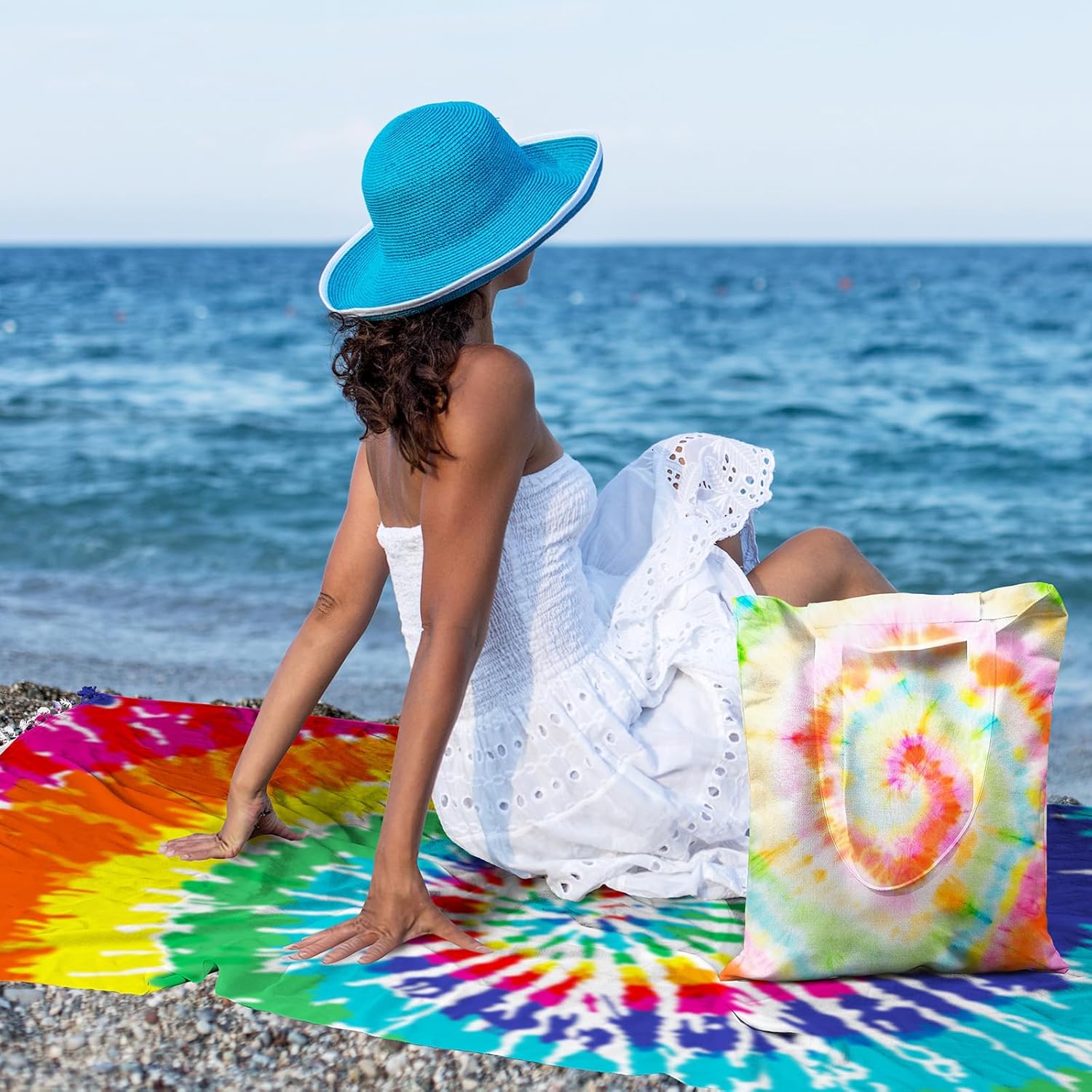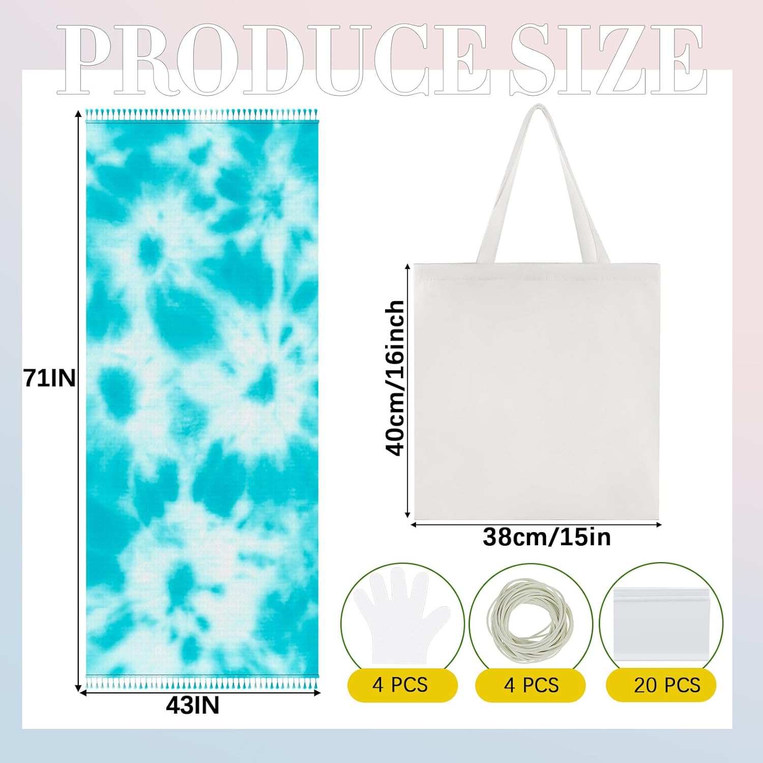 Features: Bulk for Tie-Dye Parties: With 2 large towels, 2 canvas bags, this stuff for tie dye is suitable for team or groups, summer camps, or DIY parties, create matching sets with friends! Multi-Surface: Dye the beach towels as wall hangings, transform the canvas bags into unique totes, versatile items to tie dye. Specifications: Material: cotton Color: white Size: Beach towels: 71 x 43.3 Inches / 180 x 110 cm Tote bags: 12 x 14 inches / 30.5 x 35.5 cm Package includes: 2 x Beach towels 2 x Tote bags 20 x Rubber bands 4 Pairs gloves 4 x Bags Notes: Manual measurement, please allow slight errors on size. The color may exist a slight difference due to different screen displays.