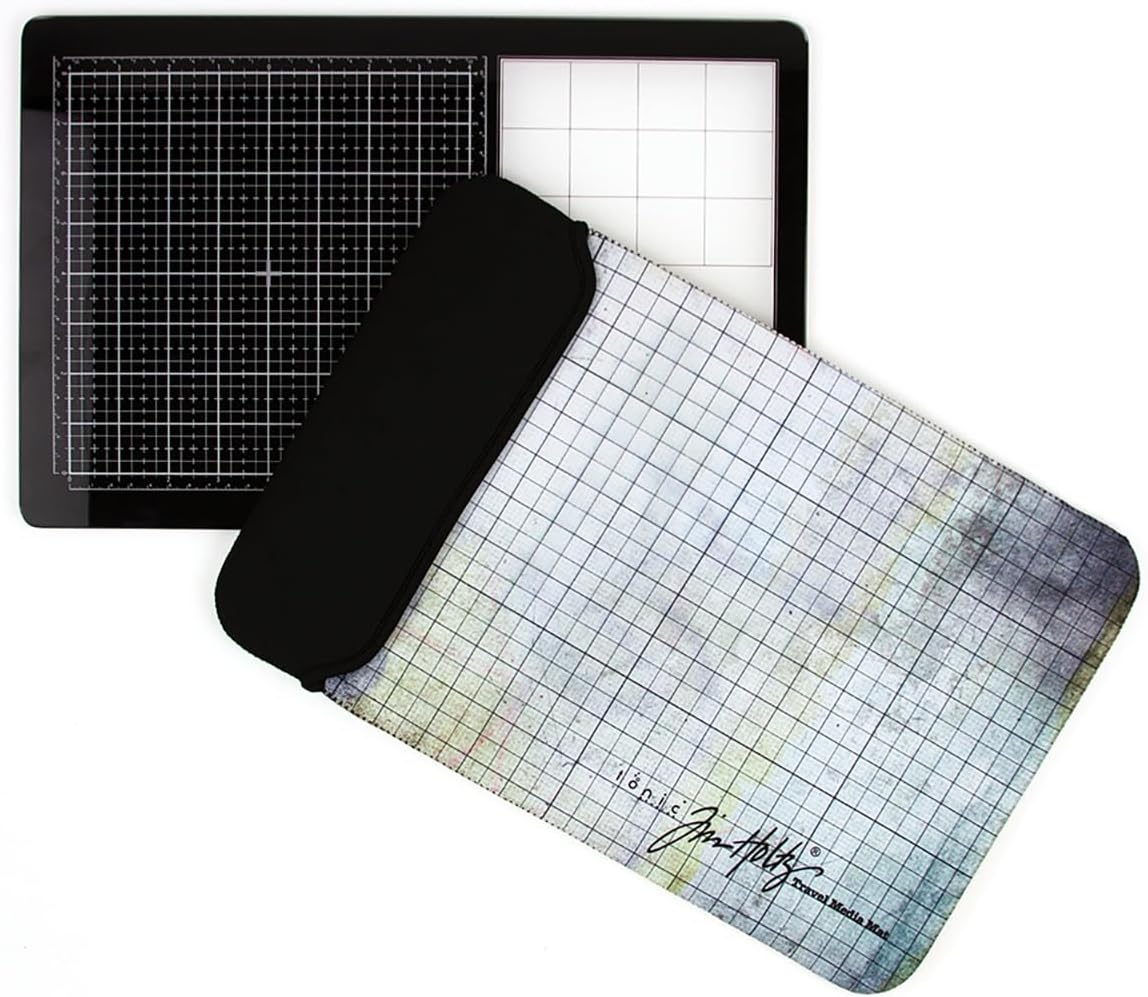 Unleash your creativity with the Tim Holtz Travel Glass Cutting Mat. This glass media mat is a multipurpose art tool with two distinct work spaces for measuring/cutting and mixing/blending. Portable mat comes with protective carry case and is great for on-the-go projects or compact work spaces. Use this versatile craft mat for measuring fabric, cutting scrapbook paper, gluing, heating wax, blending inks, and mixing paints. Designed with a tempered glass surface that is strong, resistant to heat and scratches, and easy to wipe clean with a soft cloth and water. The black background makes it easy to view the white measurements and gridded markings, which are printed on the underside of the glass. The white workspace doubles as a palette for working with wet mediums like inks or watercolors. Set includes a white mixing mat with non-stick silicone backing to easily adhere and remove from the glass. Mat measures 15.75x10.25 inches overall with 8x8-inch measuring workspace and 5.5x7.5-inch mixing palette.