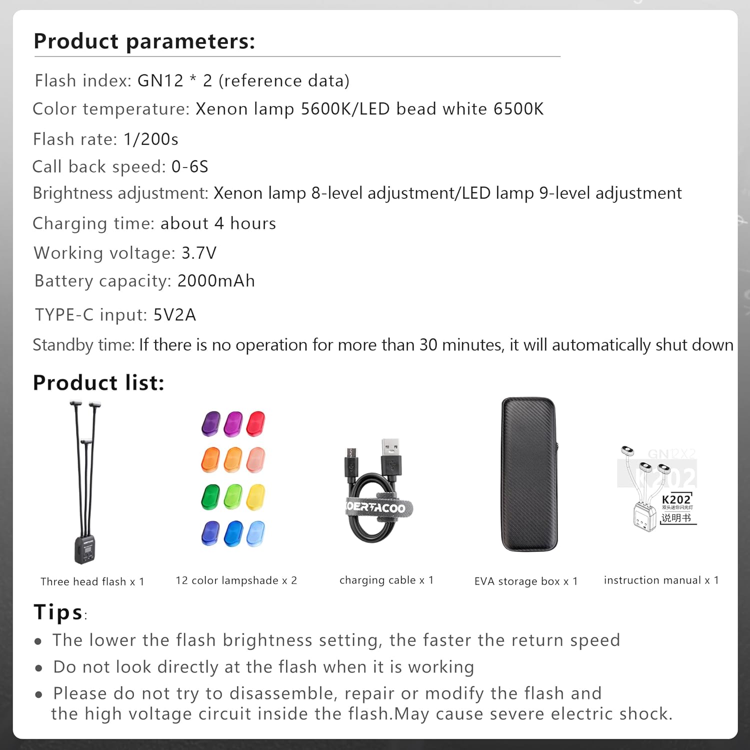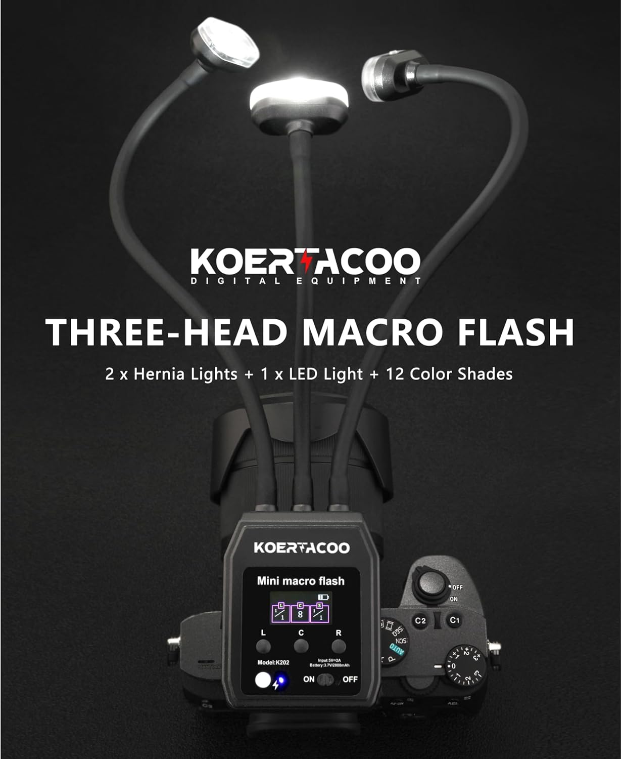 "Elevate Your Macro Photography with the Triple-Head Macro Flash Capture stunning close-up shots with our advanced triple-head macro flash, designed specifically for macro photography enthusiasts. Featuring two powerful xenon flash tubes and a central LED continuous fill light, this flash provides balanced, shadow-free lighting to highlight the finest details. The adjustable light arms allow you to position the lights at any angle, giving you full control over the lighting setup. Whether you're photographing jewelry, insects, or other small objects, this flash ensures professional-quality results every time. Note: 1.we recommend a shutter speed of less than 1/200, otherwise, the photo may have black and white edges. When the photo isn't bright enough or too bright, you may need to adjust the aperture, ISO, or shutter speed. 2.The lower the flash brightness setting, the faster the recycling speed. 3.Do not look directly at the flash at close range while it is operating. 4.Do not attempt to disassemble, repair, or modify the flash yourself, as the high-voltage circuit inside may cause serious electric shock. Product Specifications: Flash Index: GN12x2 (reference data) Color Temperature: Xenon 5600K / LED 6500K (pure white) Battery Capacity: 2000mAh Working Voltage: 3.7V Type-C Input: 5V/2A Recycling Speed: 0-6 seconds Flash Duration: 1/200s Brightness Adjustment: 8 levels for xenon lights / 9 levels for LED light Charging Time: Approximately 4 hours Standby Time: Auto-shutdown after 30 minutes of inactivity Product Dimensions: 345*60*45mm Operating Temperature: -4°F to 140°F Package Contents: 1x Three-head macro flash (extended arm) 2x Sets of 12 Color Filters 1x Charging Cable 1x EVA Storage Case 1x User Manual Upgrade your macro photography game with this feature-rich triple-head macro flash. Perfect for capturing intricate details and achieving professional-quality results, it is a must-have tool for any photographer. Order now and take your close-up shots to the next level!"