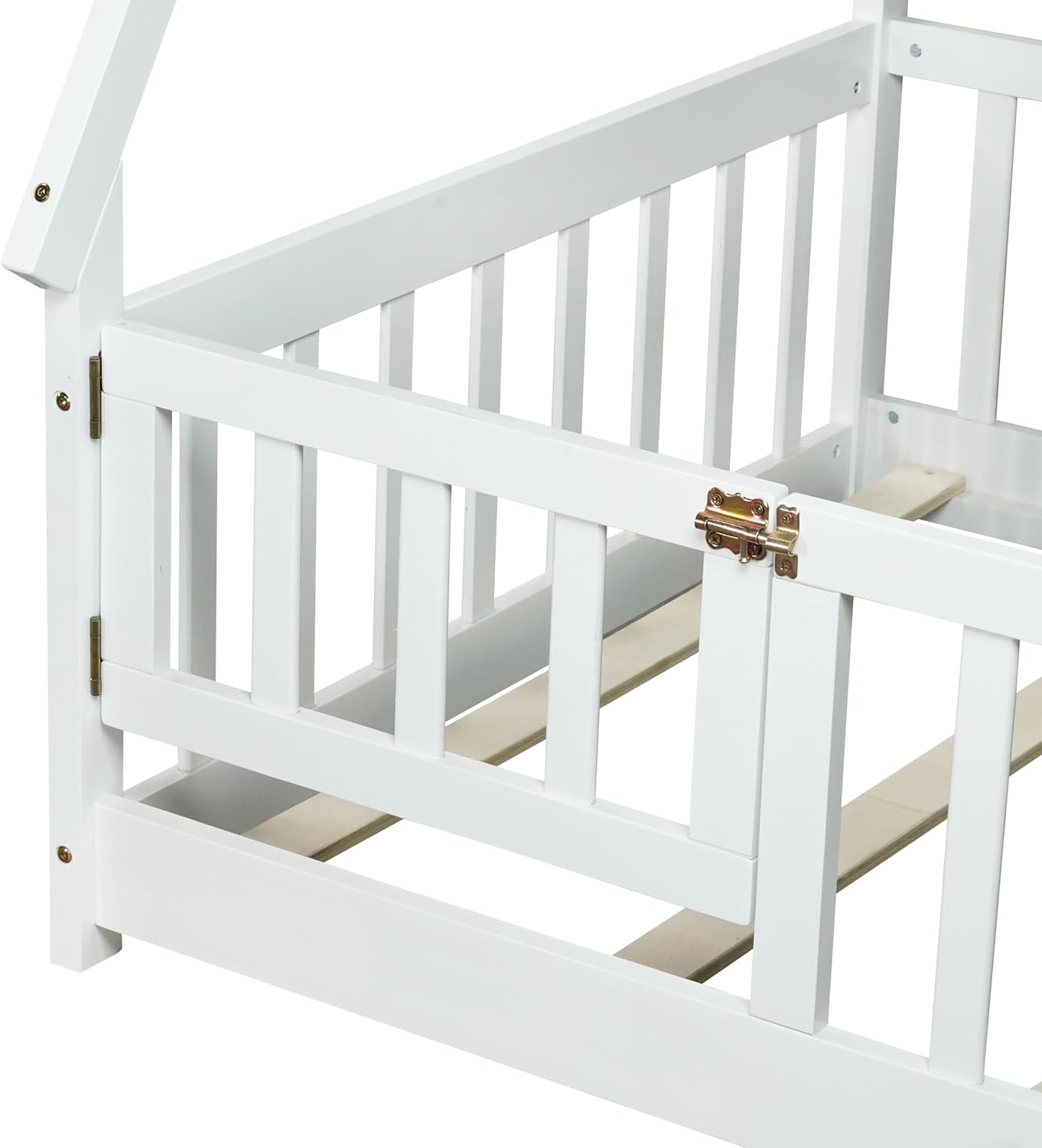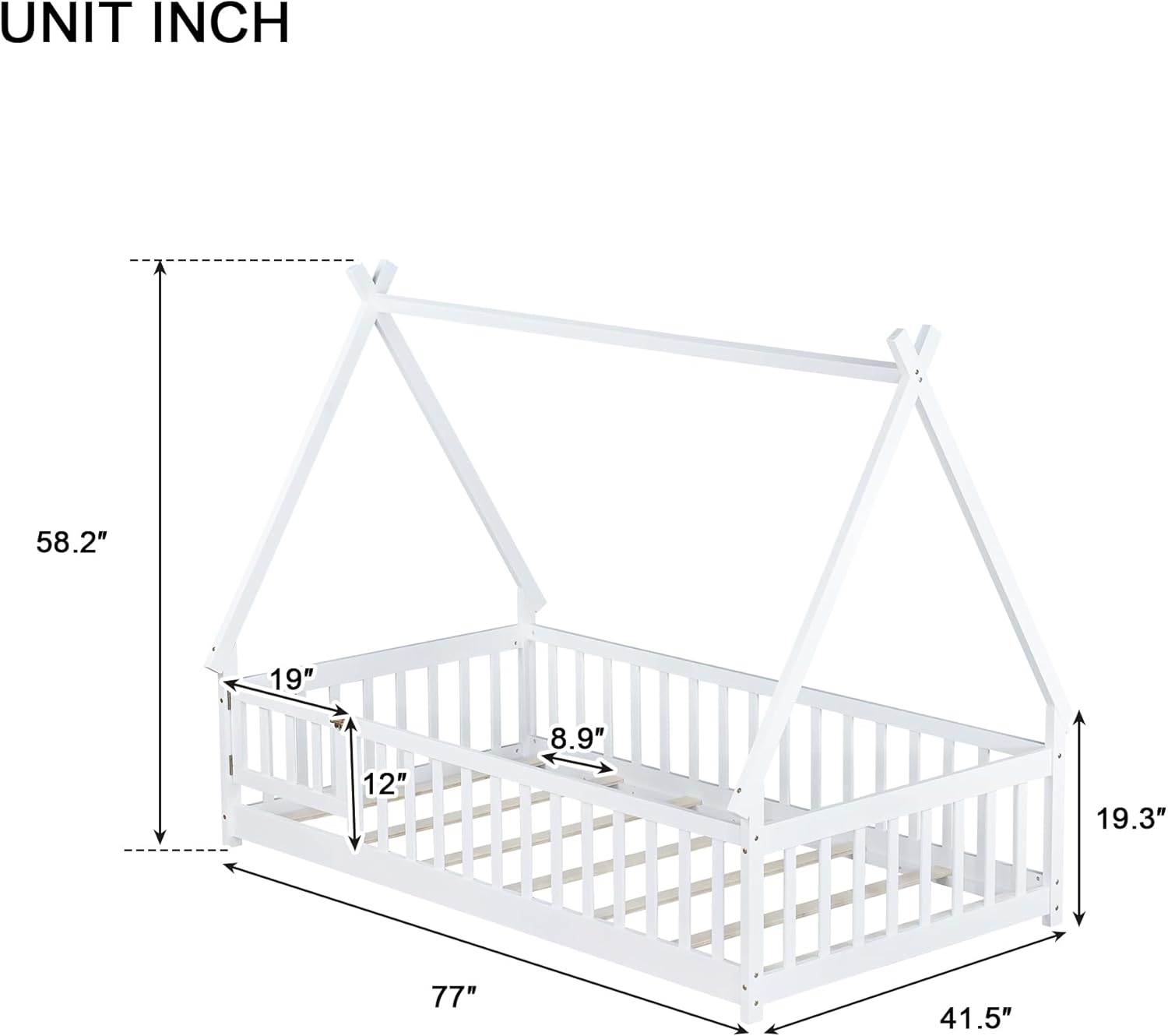 Twin Tent-shaped Floor Bed,Teepee Bed with Guardrails,Slats and Door,WhiteThis bed with tent-shaped, teepee tent is an outstanding piece that you cannot refuse! The space-optimizing and nature-oriented design is a full consideration of giving a satisfactory experience of closing to the nature and family warmth. Moreover, the teepee frame integrated to the bed provides you with architectural aesthetics, along with the contemporary and minimalist-style appearance.DescriptionTent-shaped Floor Bed with FenceSize:TwinColor: WhiteMaterial (main):rubber wood+PlywoodNumber of Slats:Bed: 7 pcsSpring Box:No needAssembly Required:YesManual and Hardware:YesCountry of Origin: MalaysiaTechnical DetailsOverall Product Dimension: 77” x 41.5” x 58.2”Overall Product Weight: 52.9 lbsPackage Details:Please refer to the SpecificationBed Weight Capacity:250 lbsSuggested Mattress Thickness:6 inches or less