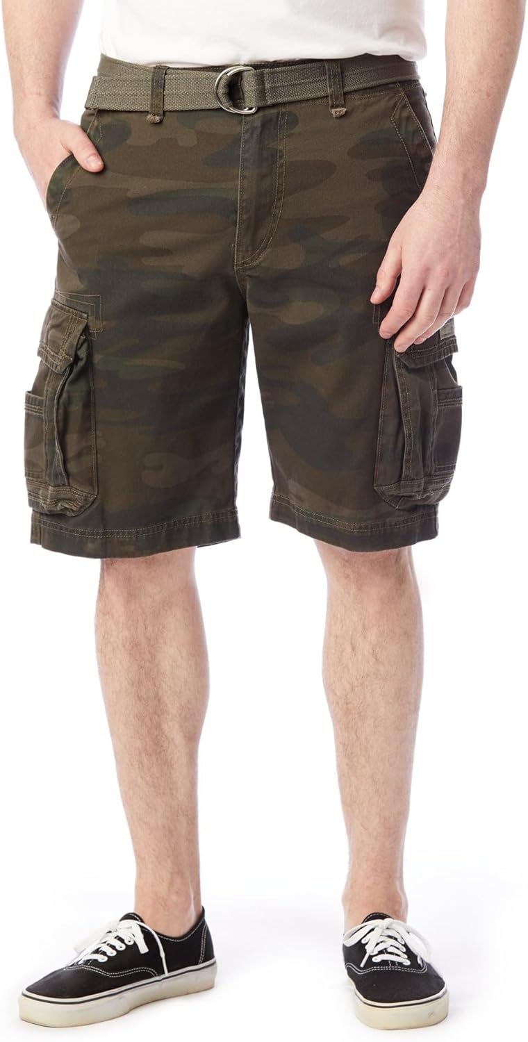 Cargo short in vintage-wash twill featuring oversize pockets and d-ring belt