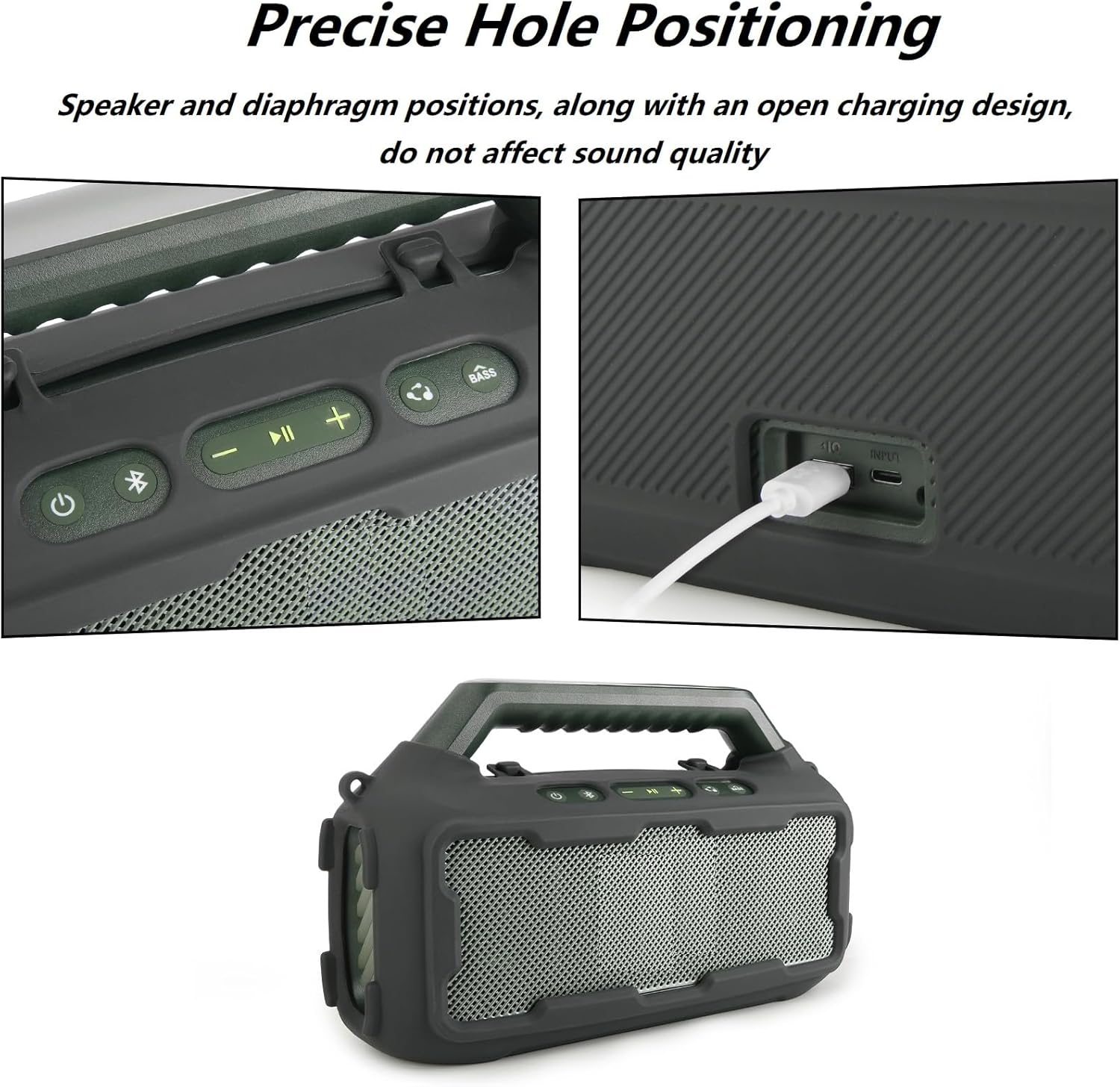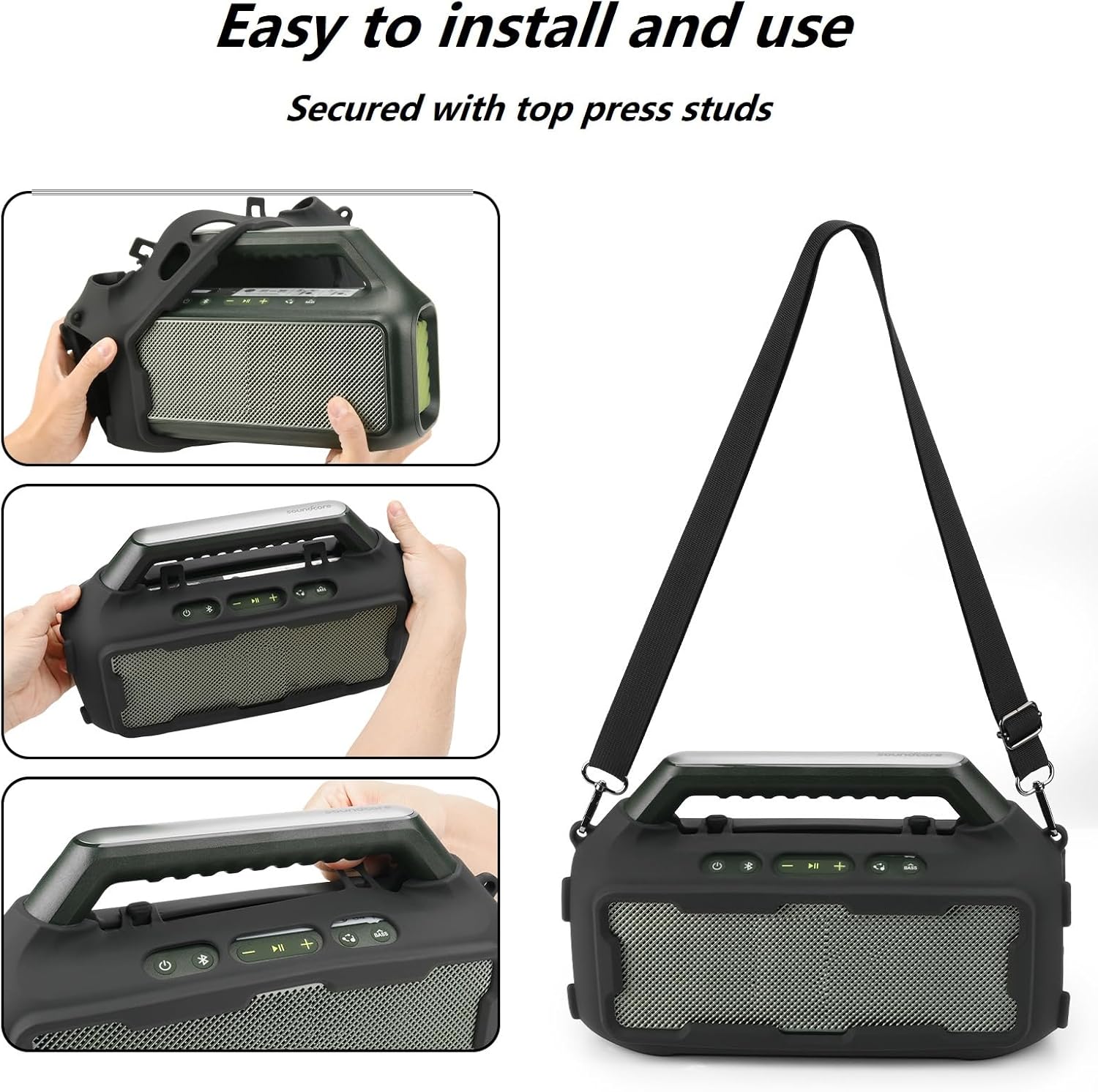 XBERSTAR silicone cover compatible with Soundcore Boom 2 delivers reliable protection with lightweight portability for every adventure. Designed for Convenience Crafted from flexible silicone,this Boom 2 silicone cover speaker offers shock absorption while maintaining a slim profile.Precise cutouts allow full access to buttons,charging port and speaker drivers without removing cover. Built for Outdoor Use This Boom 2 speaker carrying case features integrated side foot pad for stable vertical placement on any surface.Snap button closure makes installation quick.Adjustable shoulder strap with metal buckles frees your hands during travel.Strap extends 70-140cm. Specifications Material:Silicone Color:Black Dimensions:29.8cm x 12cm x 10.6cm Strap:Adjustable 70-140cm Package:1 silicone cover, 1 shoulder strap (Device not included)