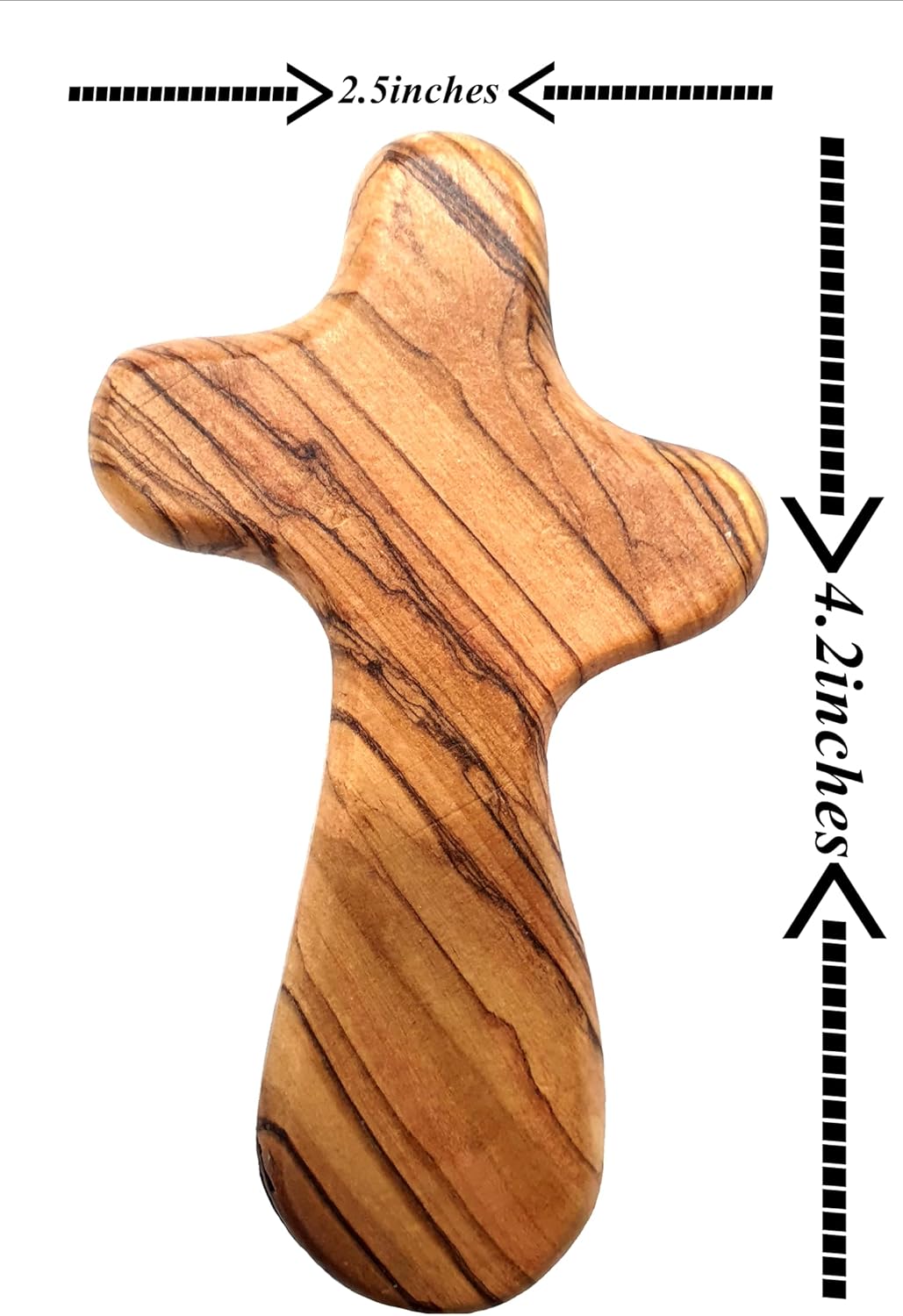 Set of 10 Olive Wood Crosses from Bethlehem The ZULUF 4.2" (10.7cm) Olive Wood Crosses from Bethlehem are carefully handcrafted by skilled artisans in the Holy Land. Each piece is shaped from authentic olive wood, giving it unique grain patterns and natural beauty. Hand Held Cross for Prayer Each hand held cross is smooth and rounded, designed to rest naturally in the palm during prayer, meditation, or quiet reflection. Its warm texture and natural feel bring comfort in moments of faith. Pocket Cross for Men and Women Compact and easy to carry, the pocket cross for men or women can be kept in a pocket, purse, or by the bedside for daily spiritual inspiration. It’s also perfect for travel, church gatherings, or hospital visits. Prayer Crosses to Hold – Wooden Prayer Cross for Hand These prayer crosses to hold are ideal for personal devotion or as thoughtful gifts for baptisms, confirmations, memorials, and other religious occasions. Each wooden prayer cross for hand comes with a Certificate of Authenticity, making it a meaningful keepsake and treasured Holy Land gift.